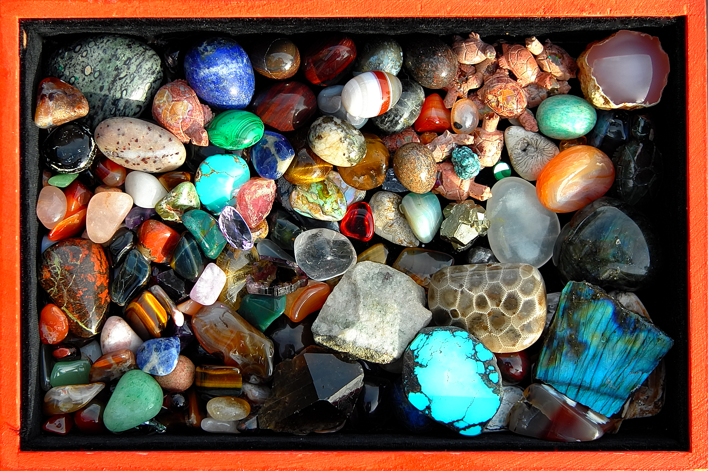 Both were lined in black velvet. The collection grew and grew, each addition with a story of its own. Opening the treasure box and sorting the stones by color, shape, or size became a favorite pastime of our children, and now, so many years later, a satisfying, relaxing, tactile escape for visiting young cousins or friends. See if you can find the tiny red gem…