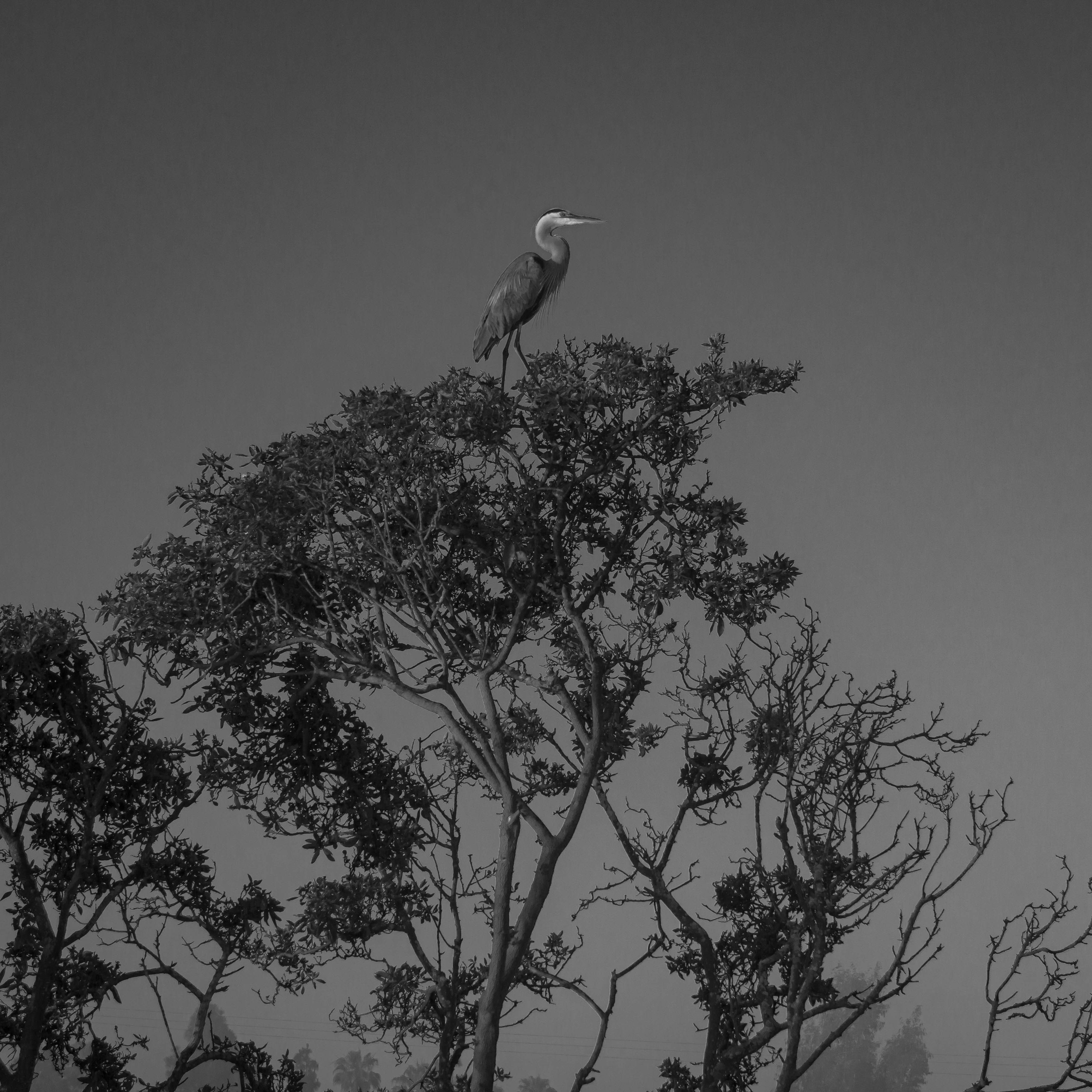 It must be nesting season because the big birds in the local Great Blue Heron heronry – numerous saucer-shaped stick nests in an ancient Eucalyptus about 1,000 yards away as the heron flies – seem to be flying more sorties than normal. This one zoomed just overhead at dawn while I was still half-asleep and scared the daylights out of me with a loud squawk before landing in the tree. After we eyed each other for about three minutes, it took off again with another squawk and glided silently toward the river, neck folded in a great gray “S” before landing softly and setting up shop at the water’s edge, waiting for an unsuspecting fish to swim close enough to make for a tasty breakfast.