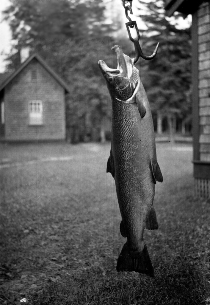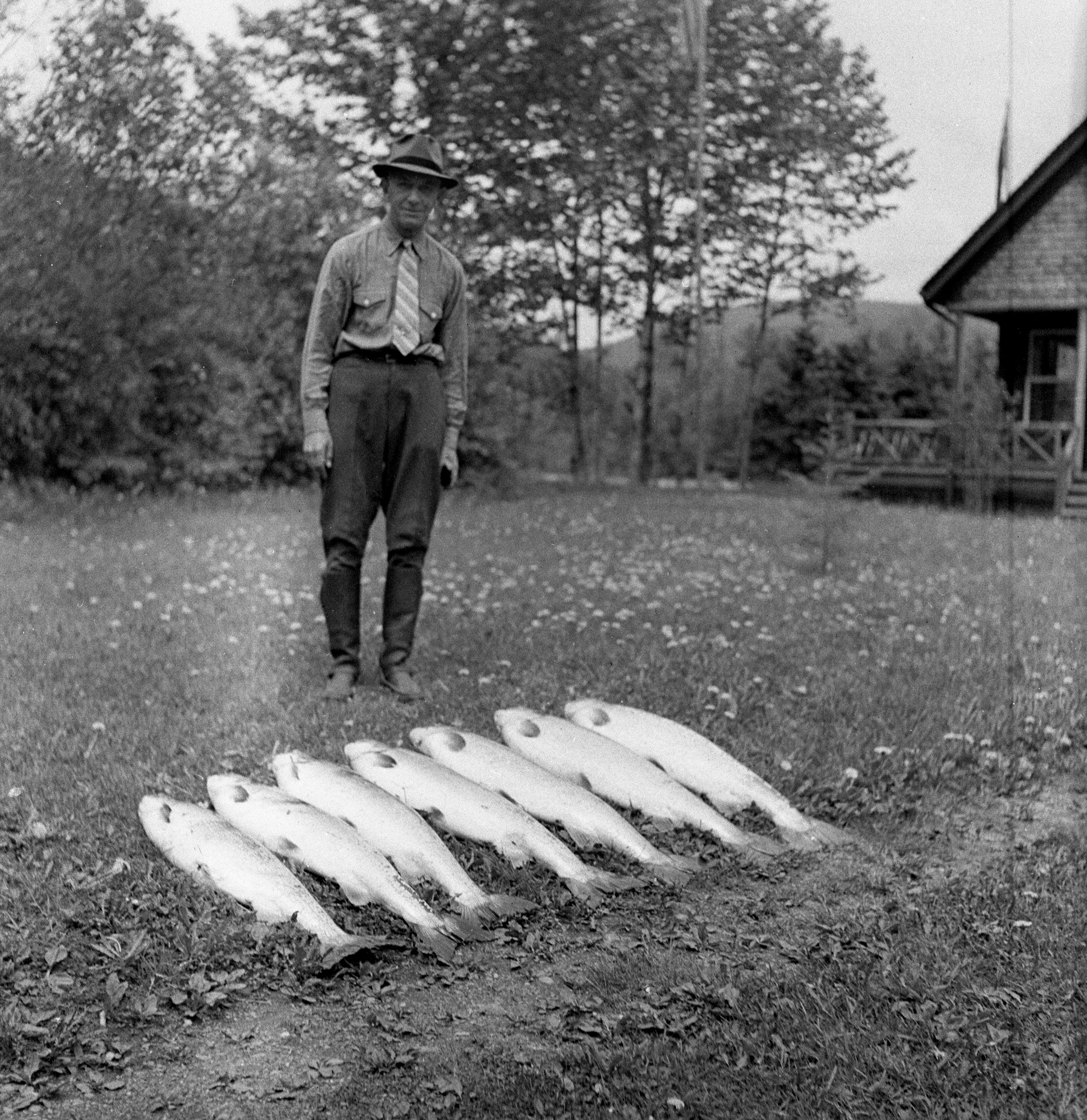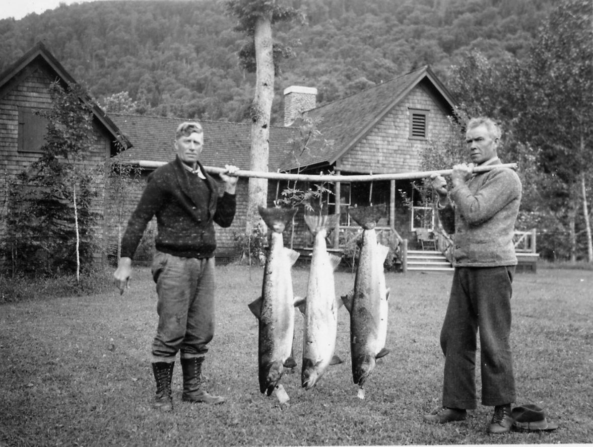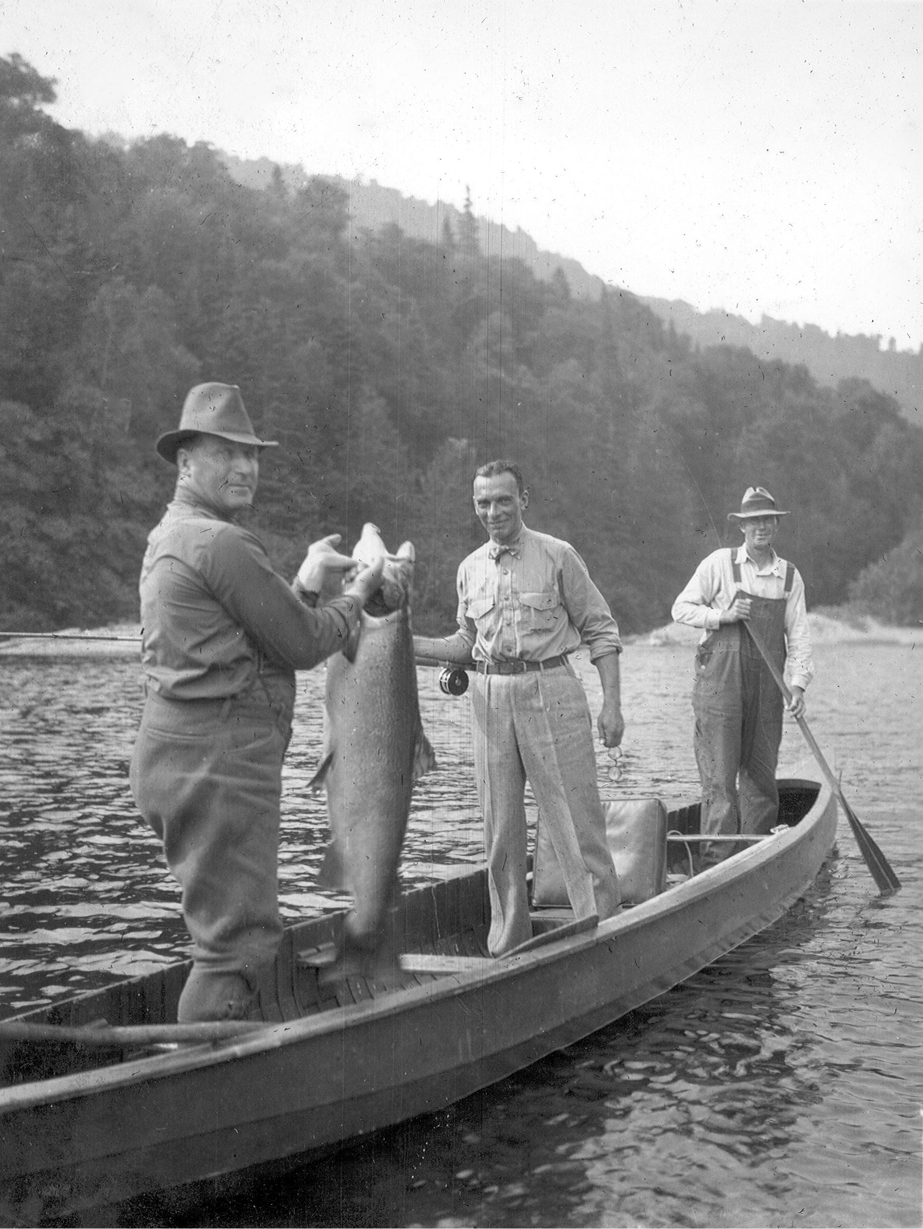 Joseph B. SchlotmanMiddle CampWilliam MershonErnie TurnerTwo guides55# Salmon (hen) caught at Jam Rapids, Grand Cascapedia River, on June 27, 1939 by Edmond Bradley Martin. Length: 49″ Girth 29″ Scale reading by Dr. David L. Belling 4 years in river 4 years at sea Maiden fish