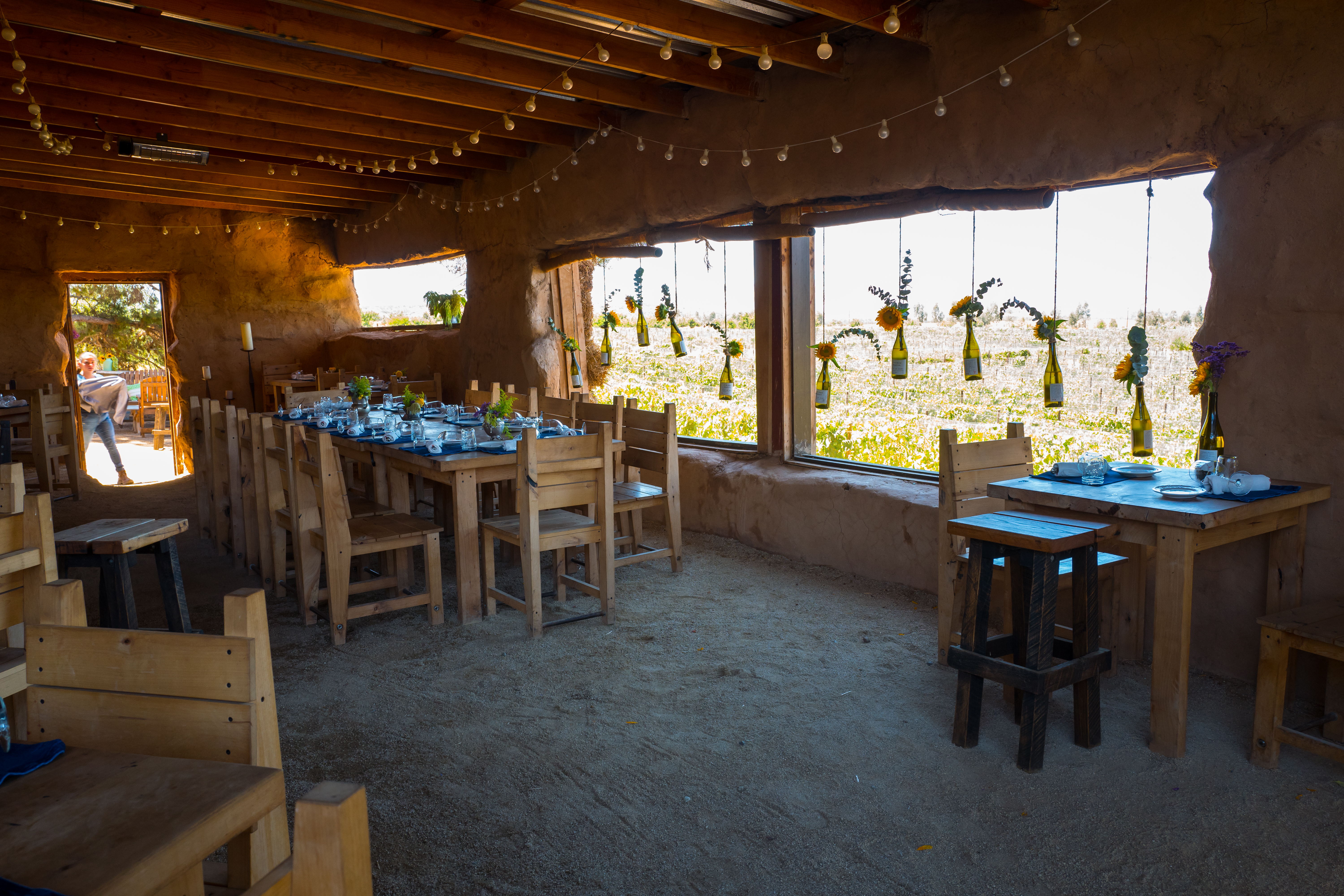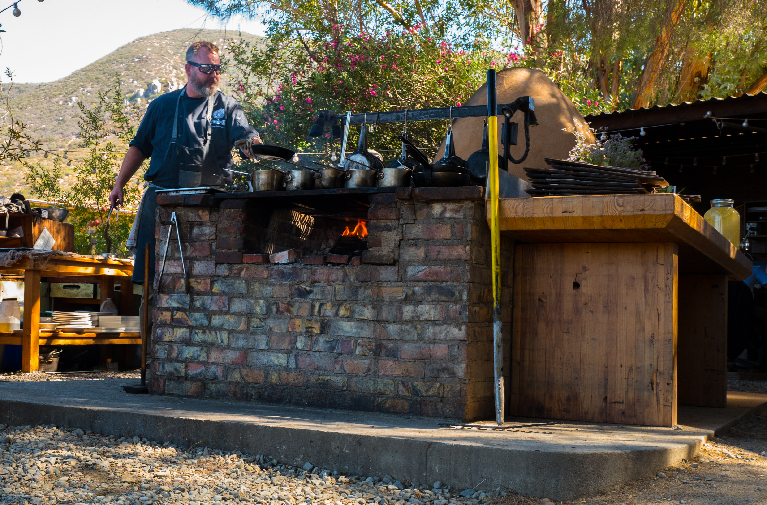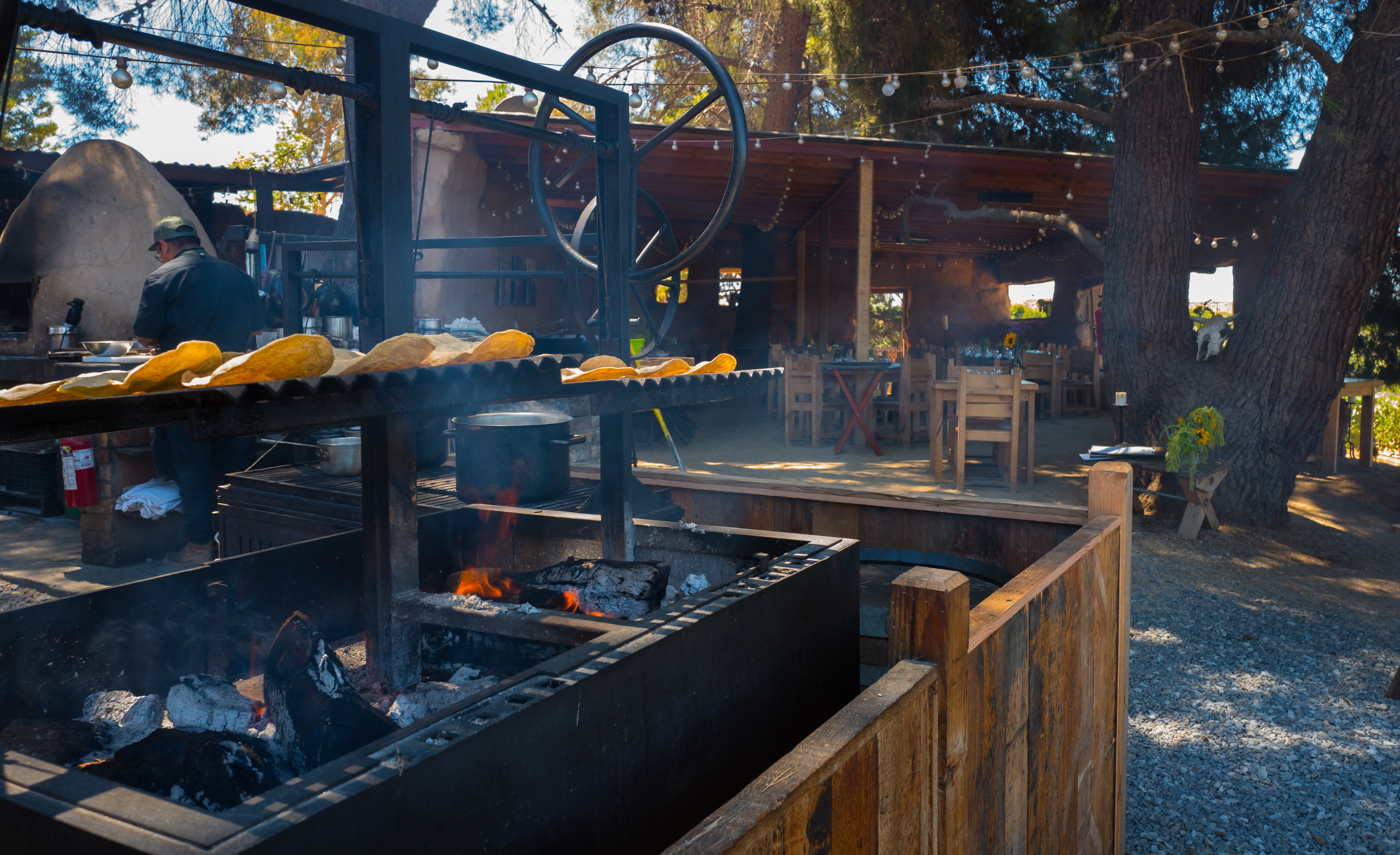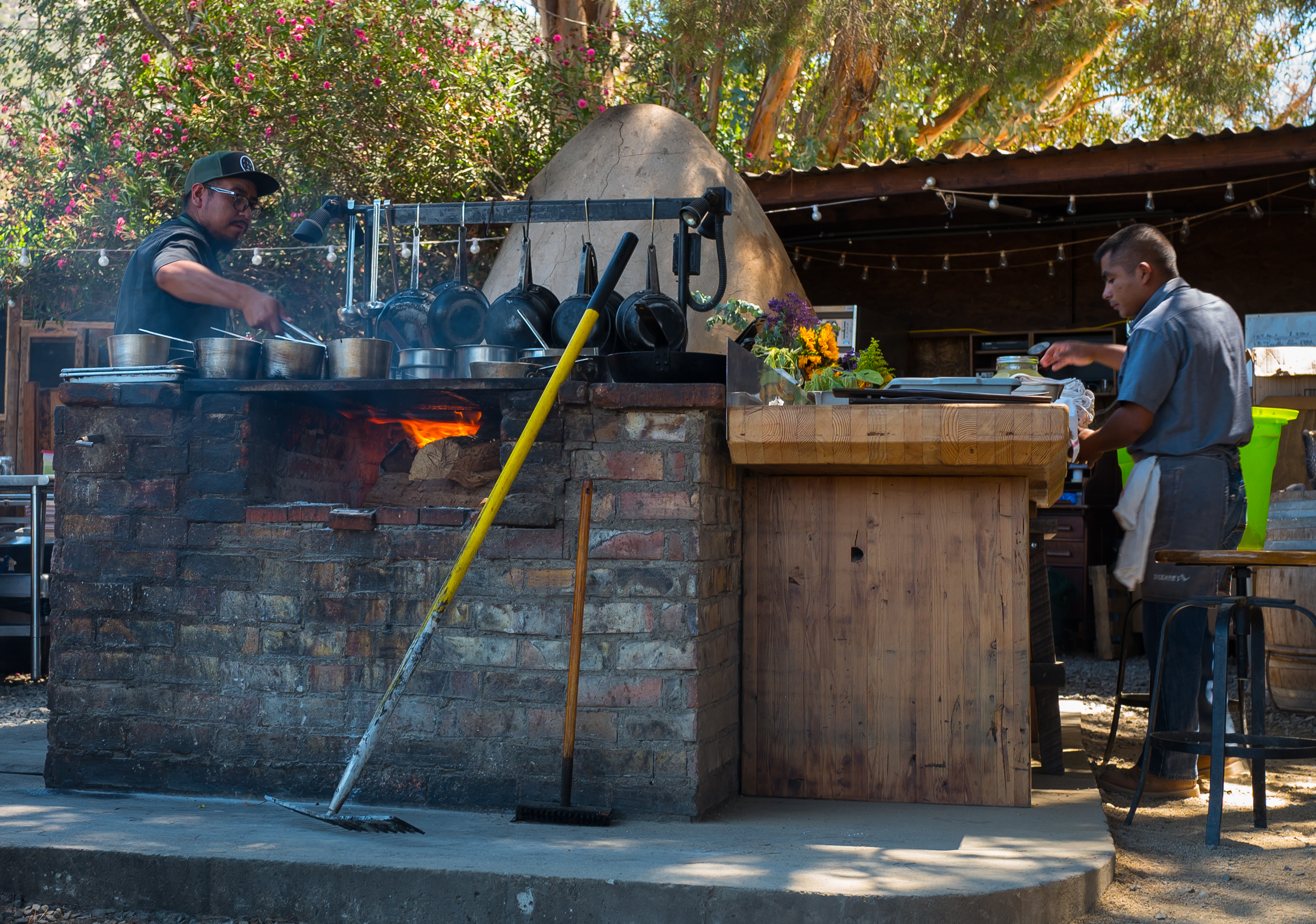 A series of stepping stones leads through a low canopy of red oleander blossoms, past stacked hay bales and a large woodpile of oak and carob, and into what can only be described as a fairy-tale-like setting; an open-air kitchen and dining area shaded by three towering pine and eucalyptus trees, anchored by a briskly burning, rustic brick hearth, several grills, thick wood work stations, and a central beehive oven. Simple wooden tables and chairs – set over a carpet of pine needles and gravel under low-hanging pine boughs and festive string lights – are arranged to catch the prevailing breeze and drink in views of Mogor-Badán’s vibrant green vineyard, as does a separate, tin-covered enclosure made of hay bales, chicken wire, adobe, and wood planks.