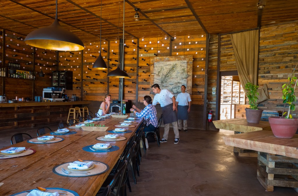 Pours of L.A. Cetto’s five, “reserve” wines make for a cheerful and educational 30-minute tasting and introduction to the valley before driving a couple of miles down the road to investigate Encuentro Guadalupe, a minimalist resort with rooms perched like space-age outcroppings on both sides of a boulder-strewn hill rearing above the valley. The complex comprises 22 modern steel, glass, and wood eco-lofts, as well as a restaurant, swimming pool, bar, vineyard, and young winery (so far, Encuentro’s architects and designers have better taste than the wine).